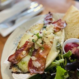 Stopped by with our LO for a quick breakfast before nap time. As others have mentioned, it doesn't look like much on the outside but on the inside it is charming! Walk up counter for pastries and drinks, small bar area where they had football playing on the screen, and many small tables inside for diners that are close toge. It was loud but not overwhelming. Too loud for any nap to take place but you can hear your own conversation. I ordered a wrap that came with a side of fresh fruit and my husband ordered a burger w/fries. I really wanted the biscuits and gravy or the baked pesto eggs but we were running short on time before happy baby turned into a not so happy one. The wrap was surprisingly really good - came hot, had great flavor, and I devoured it easily. My husband enjoyed his burger and they had delicious shoestring fries. We only saw our server twice and they were nice but I wouldn't say the service was anything worth nothing that day - for it being a Saturday morning. They were busy (maybe 60% full) but not crammed packed. Walk up to the counter to pay when you are finished. Plenty of parking in a large lot to the right of the restaurant. We would happily eat here again to try some of the other dishes.